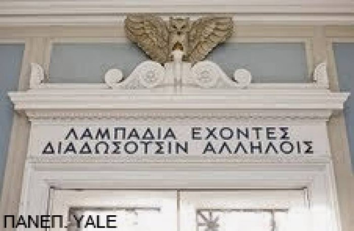 Πανεπιστήμιο «Yale» στις ΗΠΑ. Φράση από την «Πολιτεία» του Πλάτωνος: «Λαμπάδια ἔχοντες διαδώσουσιν ἀλλήλοις» (Οι φέροντες τις δάδες τις μεταλαμπαδεύουν ο ένας στον άλλον).