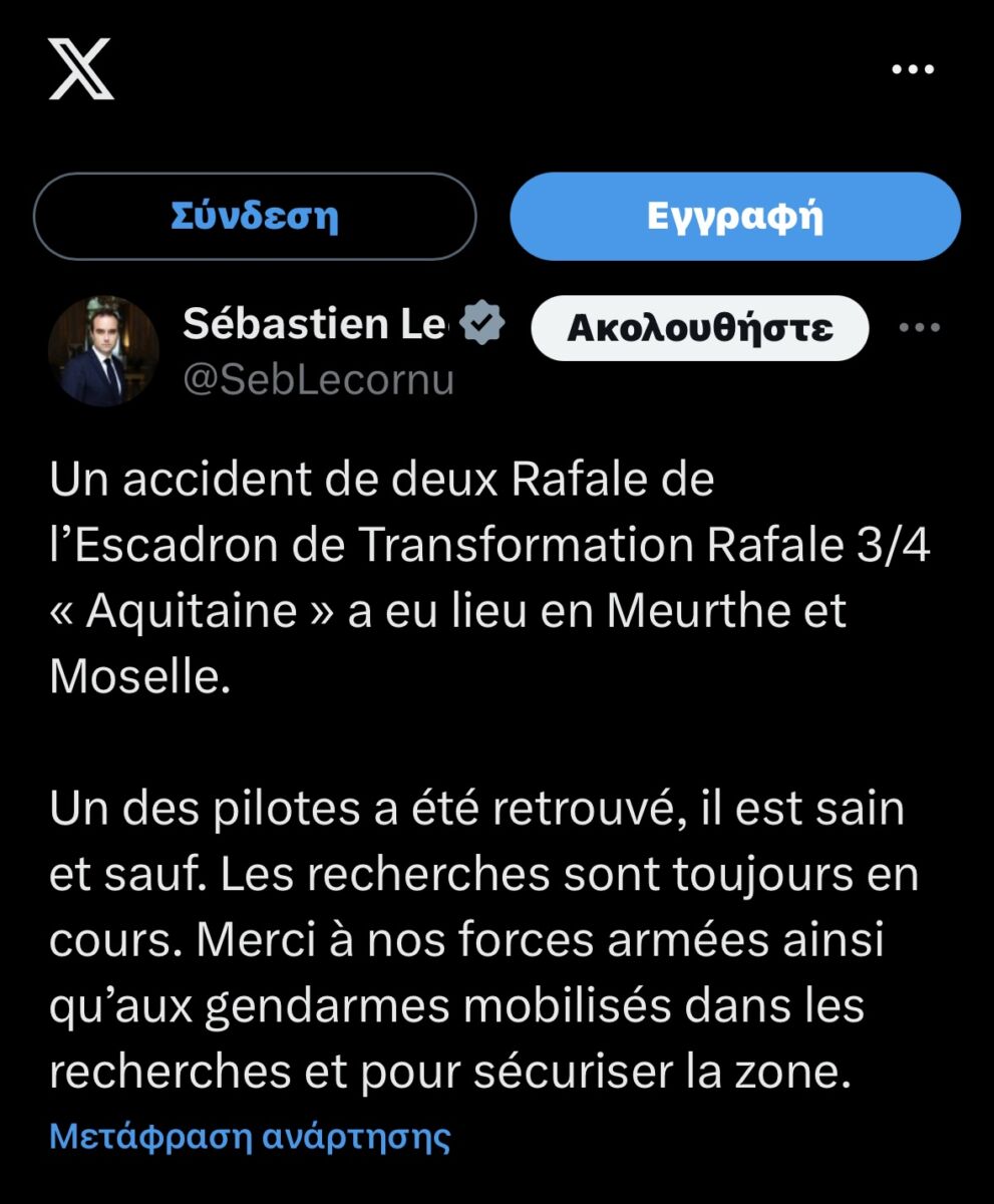 Ο πιλότος του δεύτερου αεροσκάφους βρέθηκε τραυματισμένος καθώς πρόλαβε να χρησιμοποιήσει το σύστημα εκτόξευσης και πλέον είναι ασφαλής, ξεκαθάρισε ο υπουργός των Ενόπλων Δυνάμεων της Γαλλίας Σεμπαστιέν Λεκορνύ με ανάρτησή του στο Χ