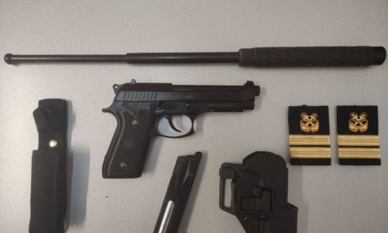 Σύμφωνα με τη σχετική ανακοίνωση από το Λιμενικό Σώμα, ο 46χρονος εντοπίστηκε στην μαρίνα του Αγίου Κοσμά, να έχει στην κατοχή του ένα οπλισμένο πιστόλι διαμετρήματος 4,5 mm με γεμιστήρα καθώς και μία μεταλλική πτυσσόμενη ράβδο συνολικού μήκους 55 εκατοστών.