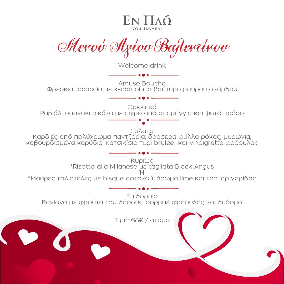 Γεύσεις Αγάπης, Αρώματα Πάθους για μια μοναδική βραδιά για δύο στο γνωστό En Plo στη Βουλιαγμένη .Η βραδιά του έρωτα στο EnPlo έχει συνδυαστεί με υπέροχα τραγούδια από την Τερέζα ,Γιώργο Γερολυμάτο και τους Latin Touch.