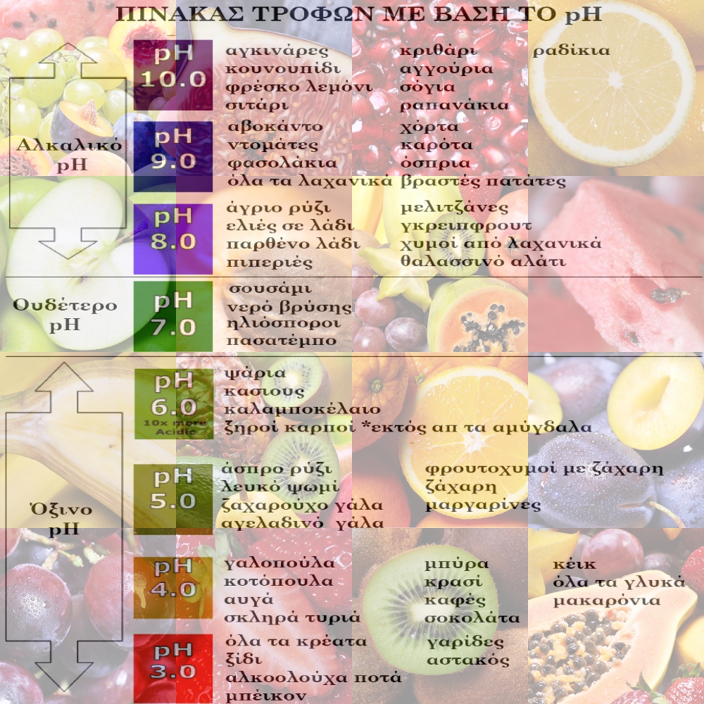 Μια αλκαλική διατροφή, βοηθά στην εξισορρόπηση των τιμών του pH.Αυτό που ονομάζουμε pH είναι η συντομογραφία του potential Hydrogen, ή αλλιώς η ενεργός οξύτητα. Στην ουσία μετρά την οξύτητα ή την αλκαλικότητα των υγρών και των ιστών του σώματός μας και μετράται σε κλίμακα από 0 έως 14. Όσο πιο όξινο είναι το διάλυμα, τόσο μικρότερη η τιμή του pH και αντιθέτως.