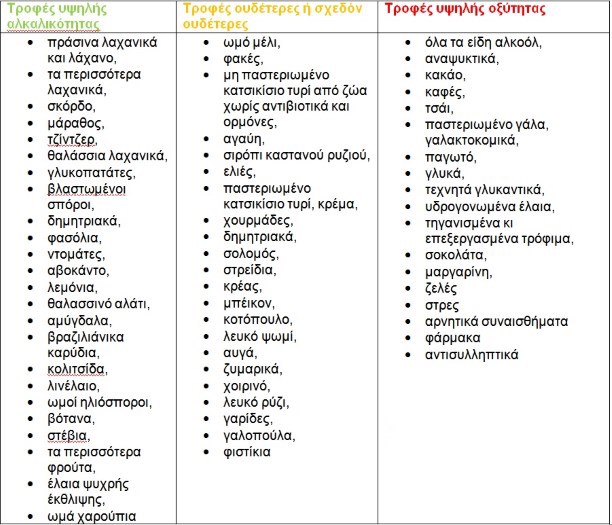 Τα τρόφιμα που είναι όξινα, και επομένως θα πρέπει να περιορίζονται σε μια αλκαλική διατροφή, περιλαμβάνουν τρόφιμα με υψηλή περιεκτικότητα σε νάτριο, μεγάλη ποσότητα κρέατος, τεχνητά σάκχαρα και γάλα.