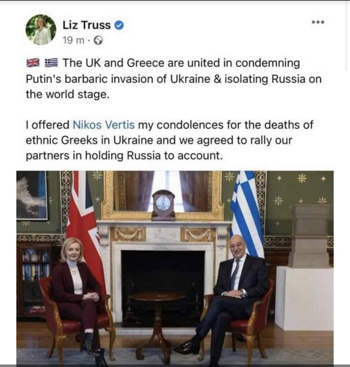 Δεν ήξερε με ποιον συναντήθηκε;Η Βρετανίδα ΥΠΕΞ Liz Truss κάνει tag τον Νίκο Βέρτη αντί για τον Νίκο Δένδια στο twitter!