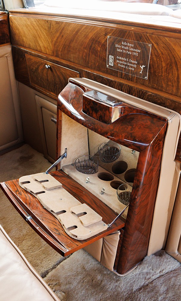 Το αυτοκίνητο έχει το στυλ και τη χάρη της «Jackie O» και εκφράζει την κομψότητα και την κλάση της. Αυτή η Rolls Royce Silver Wraith του 1952 είναι μία λιμουζίνα δύο επιβατών, με οδηγό και το τιμόνι στην αριστερή πλευρά. Είναι θωρακισμένη (για επίθεση με περίστροφο μεγάλου διαμετρήματος) και με όλες τις πολυτέλειες της εποχής της (μπαρ και μπουντουάρ).