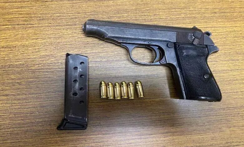 Σε έλεγχο που διενεργήθηκε, στην κατοχή του βρέθηκε πιστόλι με φυσίγγιο στη θαλάμη, καθώς και γεμιστήρας προσαρτημένος στο όπλο με πέντε φυσίγγια.