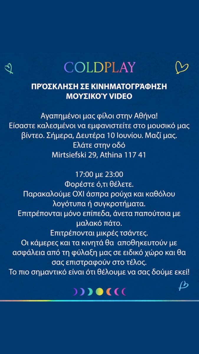 Το πρωί, ανέβηκε και άλλο story στο προφίλ του Βρετανικού συγκροτήματος, όπου προσκαλούν το κοινό τους που βρίσκεται στην Αθήνα, αν το επιθυμεί, να παίξει στο μουσικό βίντεο που πρόκειται να γυρίσουν.
