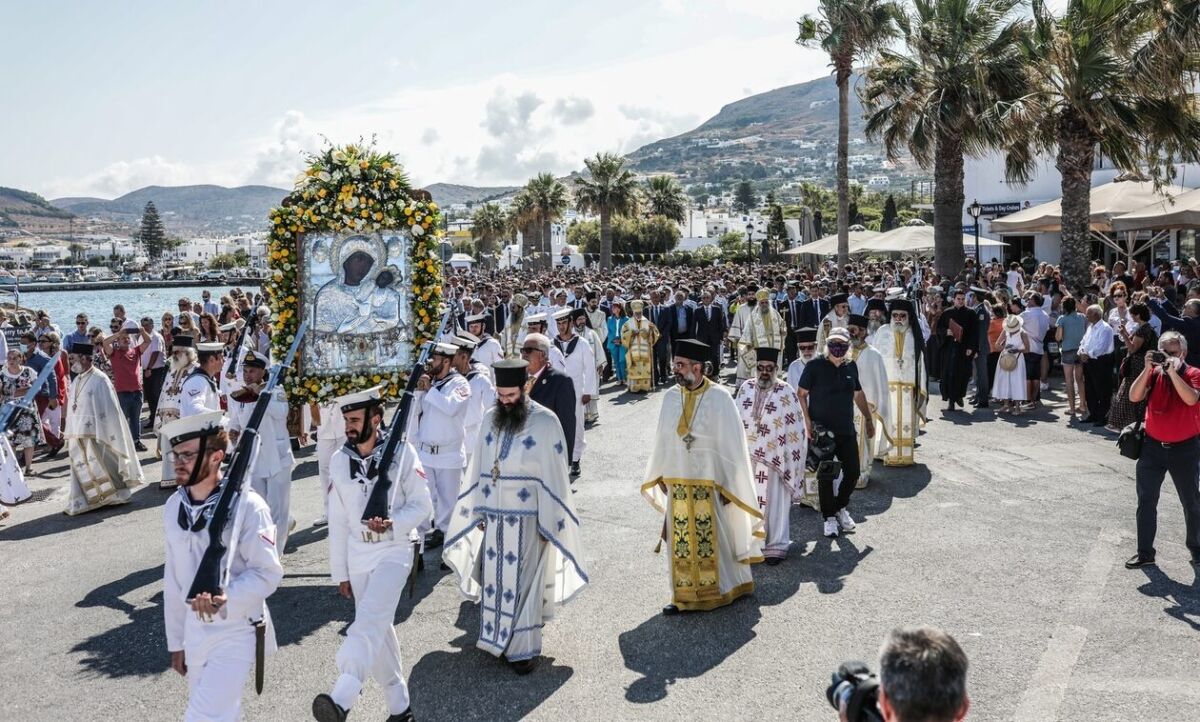 Πόλος έλξης την ημέρα του Δεκαπενταύγουστου είναι και η Πάρος, χάρη σε μια από τις εντυπωσιακότερες εκκλησίες του Αιγαίου, τον παλαιοχριστιανικό ναό της Εκατονταπυλιανής.Στην Παροικιά, την πρωτεύουσα του νησιού, η θρησκευτική τελετή χαρακτηρίζεται από την περιφορά του επιταφίου της Παναγίας. Ακολουθεί παραδοσιακό γλέντι με νησιώτικους χορούς και με το παριανό κρασί να ρέει άφθονο… Στο κοντινό λιμανάκι της Νάουσας, η νύχτα γίνεται μέρα, όταν δεκάδες καΐκια με αναμμένες δάδες προσεγγίζουν την προβλήτα δίνοντας το σύνθημα για την έναρξη της γιορτής .