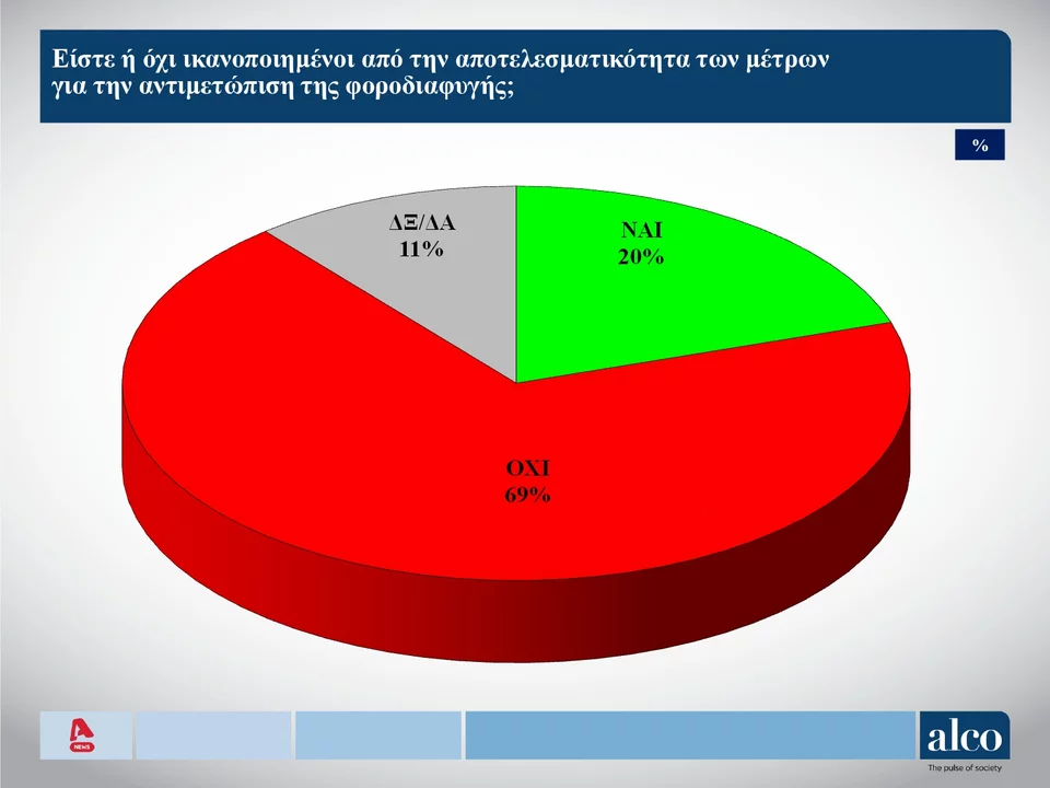Σχετικά με το εάν είναι ικανοποιημένοι από την αποτελεσματικότητα των μέτρων για την αντιμετώπιση της φοροδιαφυγής, η συντριπτική πλειοψηφία των ερωτηθέντων (69%) δήλωσε «όχι», ενώ το 20% «ναι».