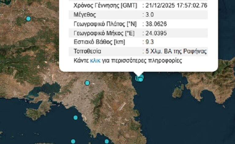 Διπλός σεισμός σημειώθηκε ανοικτά της Ραφήνας το βράδυ της Κυριακής 21 Δεκεμβρίου, σε χαμηλό εστιακό βάθος, με αποτέλεσμα οι δονήσεις να γίνουν αισθητές σε αρκετές περιοχές της Αττικής.