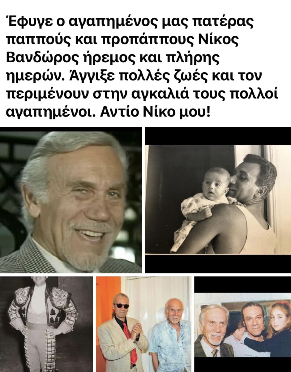 «Έφυγε ο αγαπημένος μας πατέρας παππούς και προπάππους Νίκος Βανδώρος ήρεμος και πλήρης ημερών. Άγγιξε πολλές ζωές και τον περιμένουν στην αγκαλιά τους πολλοί αγαπημένοι. Αντίο Νίκο μου!»