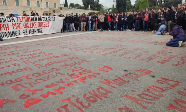 Στο Σύνταγμα εκτυλίσσονται στιγμές αρχαίας τραγωδίας στις εκδηλώσεις μνήμης για τα 57 άτομα που χάθηκαν στο σιδηροδρομικό δυστύχημα στα Τέμπη.