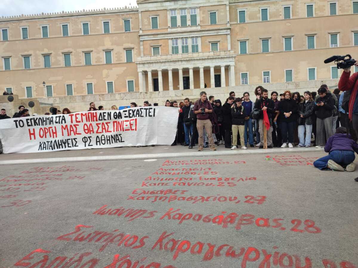 Μπροστά από το μνημείο του Άγνωστου Στρατιώτη ακριβώς κάτω από τη Βουλή έχει μαζευτεί κόσμος, κυρίως νέοι άνθρωποι και έχουν γράψει με κόκκινη μπογιά τα ονόματα όλων των θυμάτων.