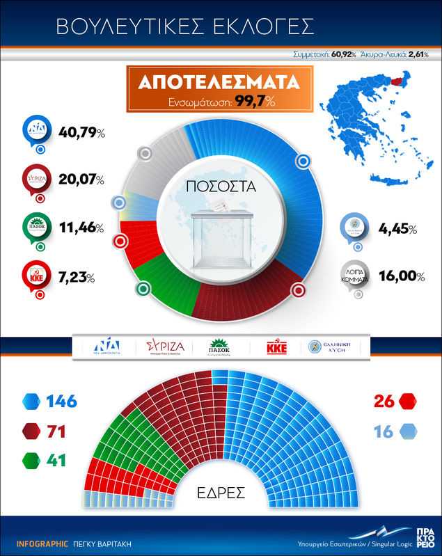 Πρώτο κόμμα ανεδείχθη η Νέα Δημοκρατία με ποσοστό 40,79% και 146 έδρες, δεύτερο κόμμα ο Συνασπισμός Ριζοσπαστικής Αριστεράς – Προοδευτική Συμμαχία με 20,07% και 71 έδρες, τρίτο κόμμα το Πανελλήνιο Σοσιαλιστικό Κίνημα – Κίνημα Αλλαγής με 11,46% και 41 έδρες, τέταρτο κόμμα το Κομμουνιστικό Κόμμα Ελλάδας με 7,23% και 26 έδρες και πέμπτο η Ελληνική Λύση με 4,45% και 16 έδρες. Κανένα κόμμα δεν κατάφερε να συγκεντρώσει την απαιτούμενη κοινοβουλευτική πλειοψηφία για τον σχηματισμό αυτοδύναμης κυβέρνησης. Στις 25 Ιουνίου οι κάλπες στήθηκαν ξανά. Στις εκλογές αυτές ίσχυσε το σύστημα της ενισχυμένης αναλογικής με βάση σχετικό νόμο του 2020. Η Νέα Δημοκρατία κατάφερε να εκλέξει 158 βουλευτές και σχημάτισε κυβέρνηση με ποσοστό αποχής 46,26%.