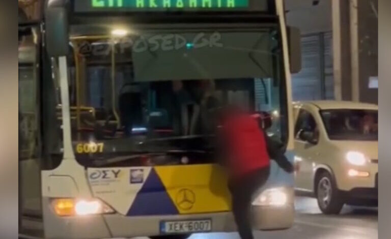 Ένταση σε φανάρι της Αθήνας: Γυναίκα ξηλώνει το μπροστινό μέρος λεωφορείου με κλωτσιές