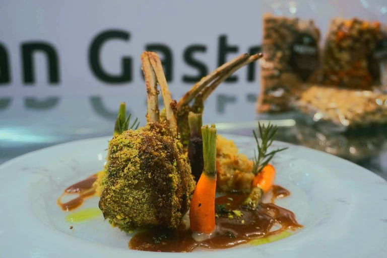 Αρνάκι με κρούστα από φιστίκι, γλάσο μελιού και λάδι μυρωδικών της Αττικής πάνω σε couscous με ρεβίθι & κόκκινη φακή (ένα από τα πιάτα της παρουσίασης)