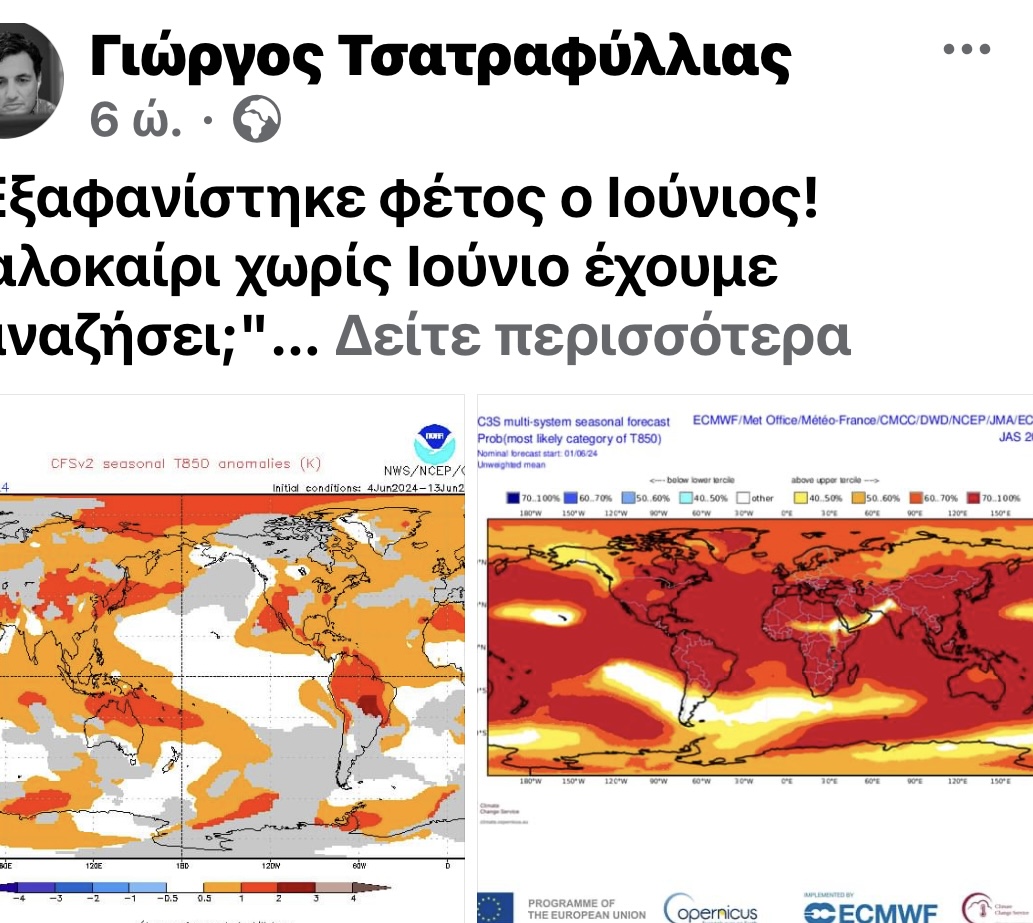 «Ο φετινός Ιούνιος είναι σίγουρο ότι θα γράψει ιστορία με τις πολύ υψηλές θερμοκρασίες που καταγράφονται. Μάλιστα αν ήταν Ιούλης θα ήταν πολύ πιο ζεστός από πολλούς του παρελθόντος! Σε ένα καλοκαίρι που εξελίσσεται πολύ θερμό, οι μακροπρόθεσμες προγνώσεις δίνουν σήμα για περισσότερη ζέστη από το κανονικό και τους υπόλοιπους μήνες (Ιούλιο, Αύγουστο, Σεπτέμβρη)».