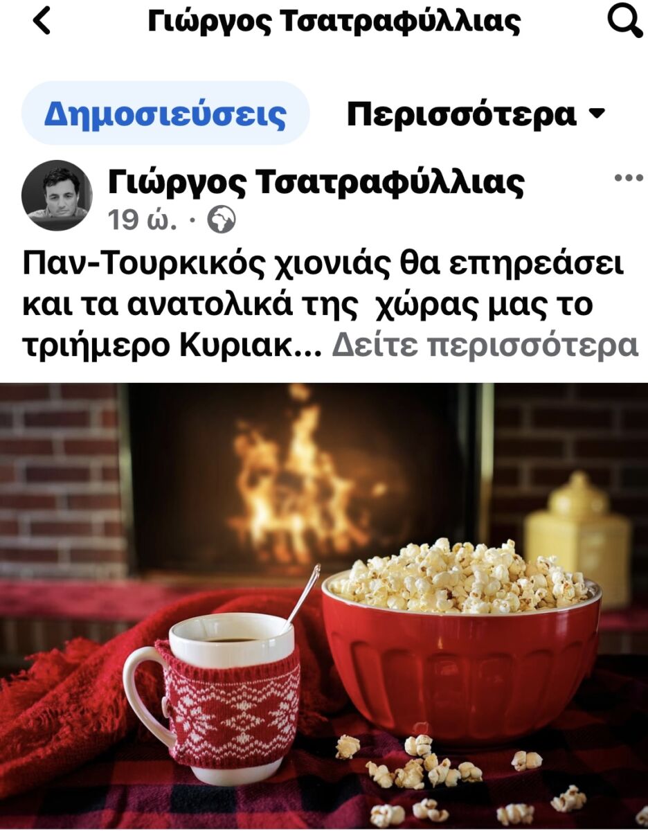 Για «Παν-Τουρκικό» χιονιά που θα «χτυπήσει» τις επόμενες ώρες έκανε λόγο με ανάρτησή του στο Facebook ο μετεωρολόγος του Alpha , Γιώργος Τσατραφυλλιας.