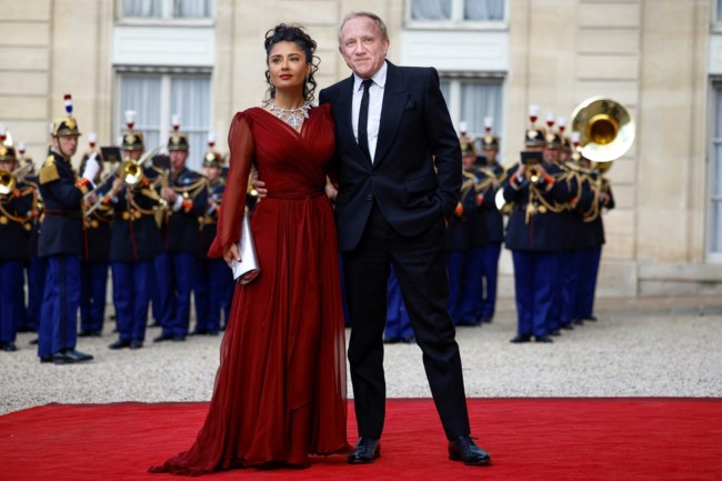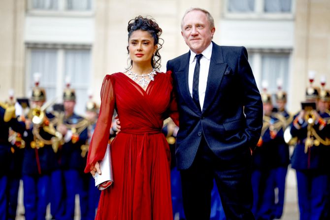 Με εμφανή τον Χολιγουντιανό αέρα που αποπνέει η ηθοποιός Σάλμα Χάγιεκ και την εξωτική κομψότητα της στο πλευρό του πολυεκαττομυριούχου συζύγου της Φρανσουά-Ανρί Πινό, επισκέφθηκε το παλάτι των Ηλυσίων στο Παρίσι, για το κρατικό δείπνο που παρέθεσε ο πρόεδρος της Γαλλίας Εμανουέλ Μακρόν, προς τιμήν του προέδρου της Κίνας Σι Τζινπίνγκ και της συζύγου του.