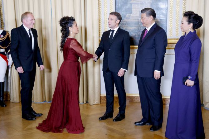 Ο Γάλλος πρόεδρος Εμανουέλ Μακρόν με την σύζυγό του Μπριζίτ υποδέχθηκε την σταρ του Χόλιγουντ με τον σύζυγό της, ενώ στη συνέχεια χαιρέτησαν και το προεδρικό ζεύγος της Κίνας, Σι Τζινπίνγκ και Πενγκ Λιγουάν.