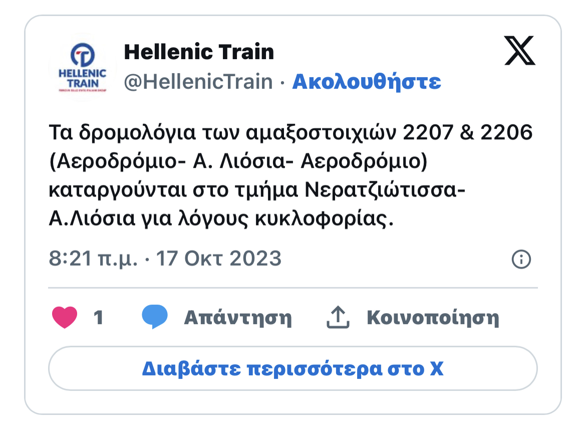 Σύμφωνα με ανακοίνωση της Hellenic Train η απόφαση για την ανωτέρω κατάργηση ελήφθη για λόγους κυκλοφορίας.