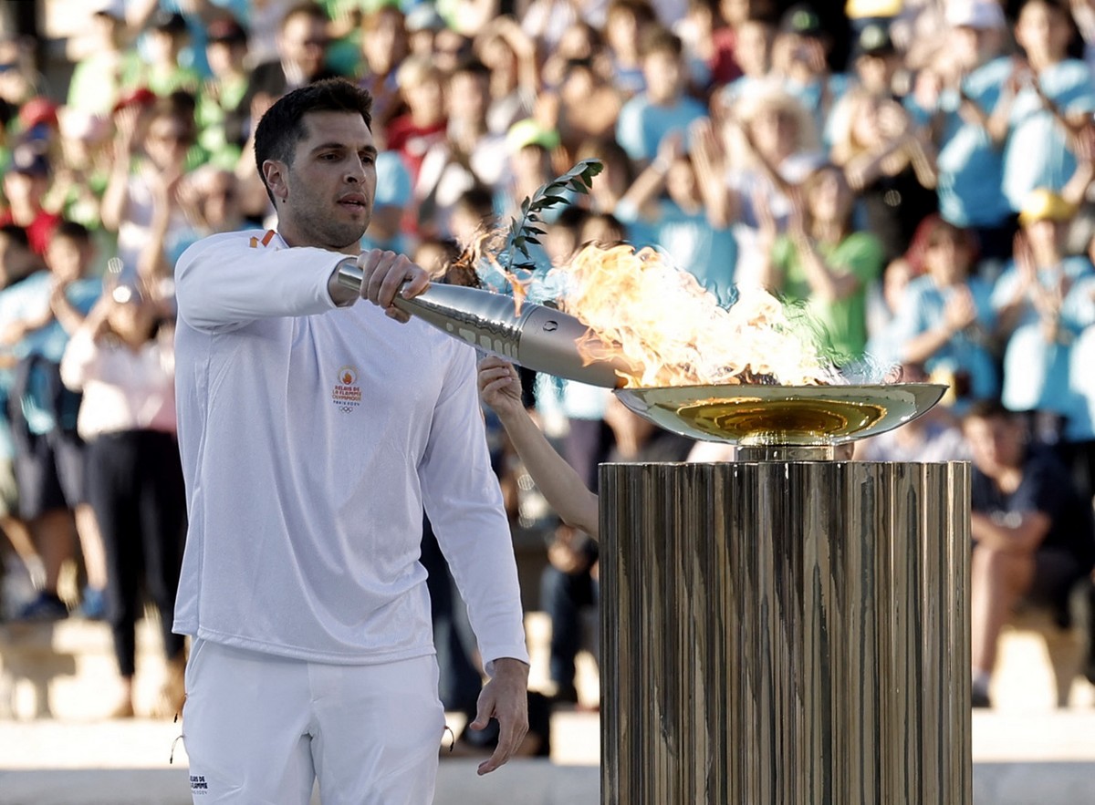 Η Μαίρη Μηνά ανάβει το βωμό (REUTERS/Louiza Vradi)Στο τέλος της τελετής ο Πρόεδρος της Ελληνικής Ολυμπιακής Επιτροπής Σπύρος Καπράλος παρέδωσε το Ολυμπιακό Φως στον Πρόεδρο της Οργανωτικής Επιτροπής «PARIS 2024» Tony Estanguet, για να συνεχίσει το ταξίδι του για το Παρίσι.