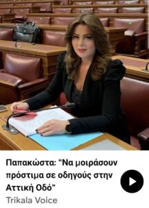 Η βουλεύτης  Τρικάλων της ΝΔ Κατερίνα Παπακώστα αξίωσε να κοπούν πρόστιμα στους οδηγούς που εγκλωβίστηκαν στην Αττική Οδό χωρίς αλυσίδες! Να την χαίρεστε βρε!
