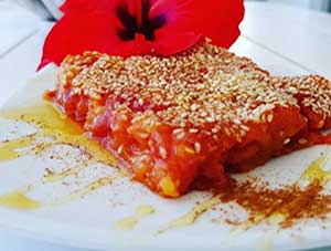 λουκουμάδες με σουσάμι, τα μελιτίνια με νιώτικη μυζήθρα, τα παστέλια με μέλι και αποξηραμένα σύκα γεμισμένα με σουσάμι, κανέλα και πορτοκάλι.