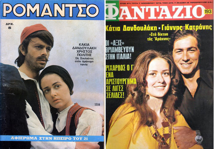 Εξώφυλλα από την περίοδο των Εθνικοπατριωτικών ταινιών. Με τον Χρήστο Πολίτη στους “Σουλιώτες” (και το όνομα της γραμμένο λάθος) και δεξιά με τον Γιάννη Κατράνη στα “Δίχτυα της αράχνης”.