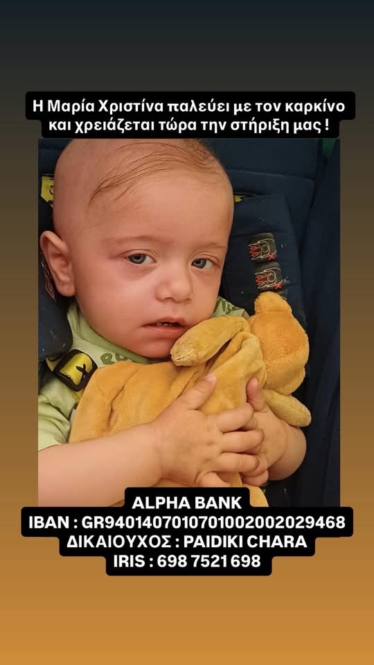 Μια πολύ σκληρή μάχη για τη ζωή της δίνει η μόλις 13 μηνών Μαρία-Χριστίνα, που διαγνώστηκε με επιθετική μορφή καρκίνου, με τη «Παιδική Χαρά» να απευθύνει δημόσια έκκληση στήριξης. Ο οργανισμός περιγράφει μια ιδιαίτερα δύσκολη κατάσταση, τονίζοντας ωστόσο ότι το μικρό κορίτσι παλεύει και ανταποκρίνεται στη θεραπεία του.