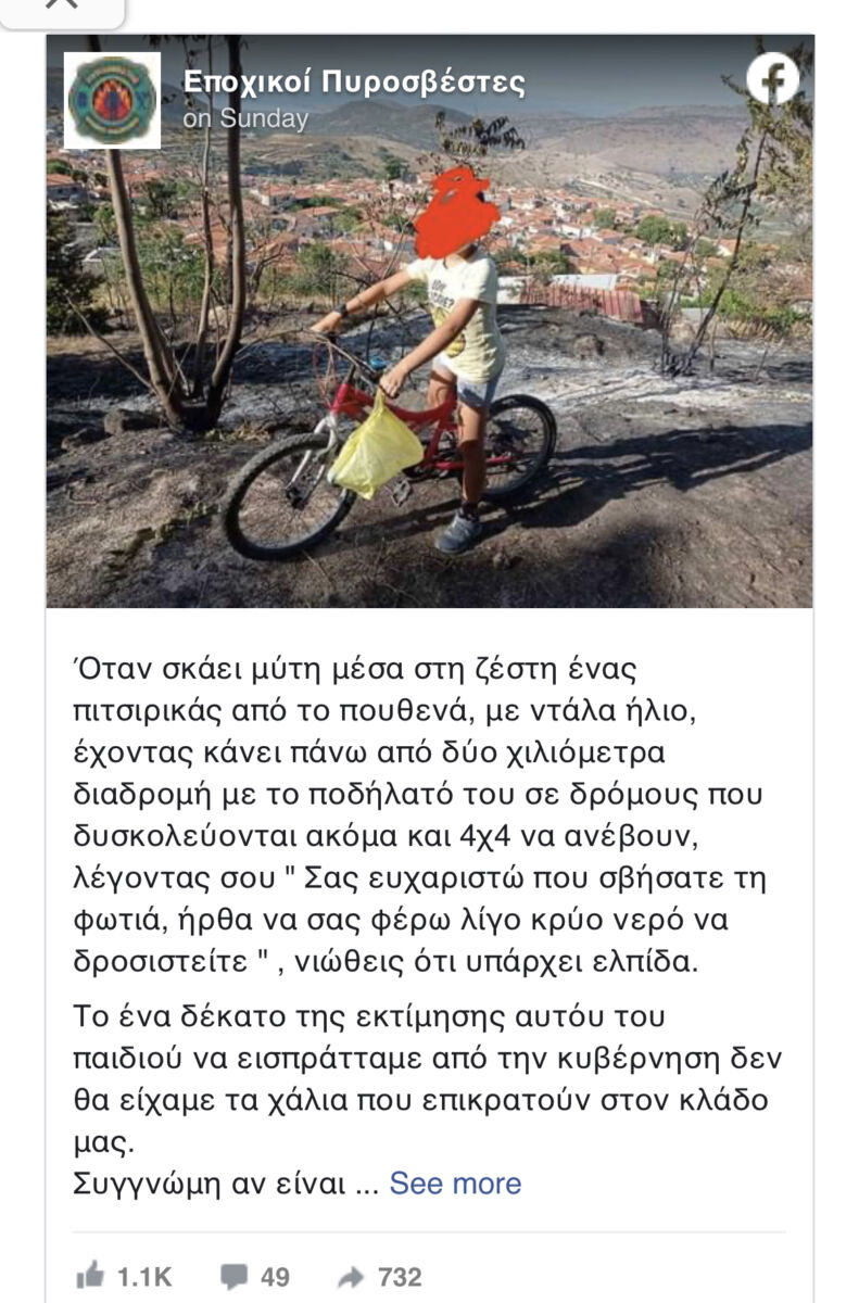 Ο μικρός, όπως αναφέρει η ανάρτηση στη σελίδα «Εποχικοί Πυροσβέστες» στο Facebook, εμφανίστηκε από το πουθενά «με ντάλα ήλιο» με το ποδήλατό του και είπε στους πυροσβέστες «Σας ευχαριστώ που σβήσατε τη φωτιά, ήρθα να σας φέρω λίγο κρύο νερό να δροσιστείτε».