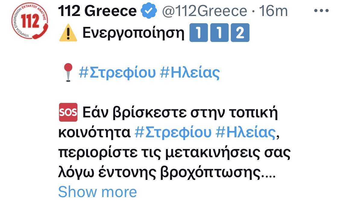 Ήχησε το 112 λόγω έντονης βροχόπτωσης στην Ηλεία – «Εάν βρίσκεται στην κοινότητα Στρεφίου, περιορίστε τις μετακινήσεις σας»