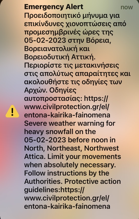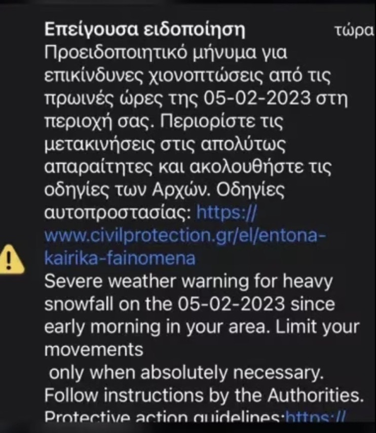 Το μήνυμα έγραφε: «Επείγουσα ειδοποίηση. Προειδοποιητικό μήνυμα για επικίνδυνες χιονοπτώσεις από τις πρωινές ώρες της 05-02-2023 στην περιοχή σας.