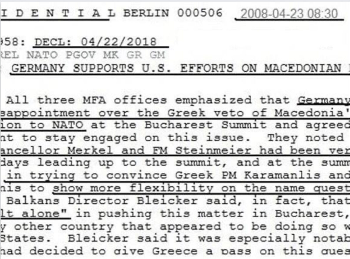 Το έγγραφο αναφέρει πως μόνο η Γερμανία απ’ όλα τα υπόλοιπα κράτη συντάσσεται με την πολιτική των ΗΠΑ και συμμερίζεται την απογοήτευση τους για το ελληνικό βέτο στην είσοδο της… “Μακεδονίας” στο ΝΑΤΟ, ενώ τονίζει πως η ίδια η Μέρκελ δραστηριοποιήθηκε ιδιαίτερα τις ημέρες πριν τη σύνοδο του ΝΑΤΟ, προκειμένου να πείσει τον Καραμανλή να βάλει νερό στο κρασί του!