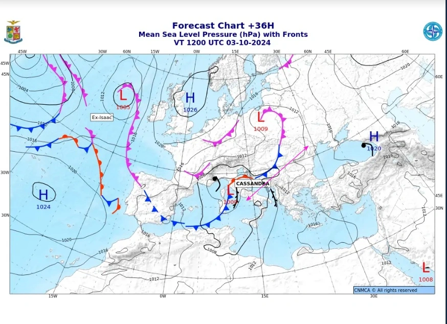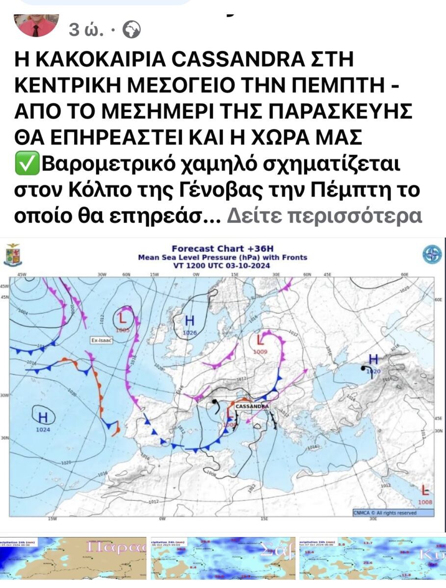 «Βαρομετρικό χαμηλό σχηματίζεται στον Κόλπο της Γένοβας την Πέμπτη, το οποίο θα επηρεάσει την Ιταλία και τις χώρες των Βορειοδυτικών Βαλκανίων με ισχυρές βροχές, ενισχυμένους ανέμους και coastal events. H κακοκαιρία έλαβε την ονομασία #Cassandra και θα κινηθεί Α-ΒΑ» αναφέρει ο Θοδωρής Κολυδάς, και προσθέτει: