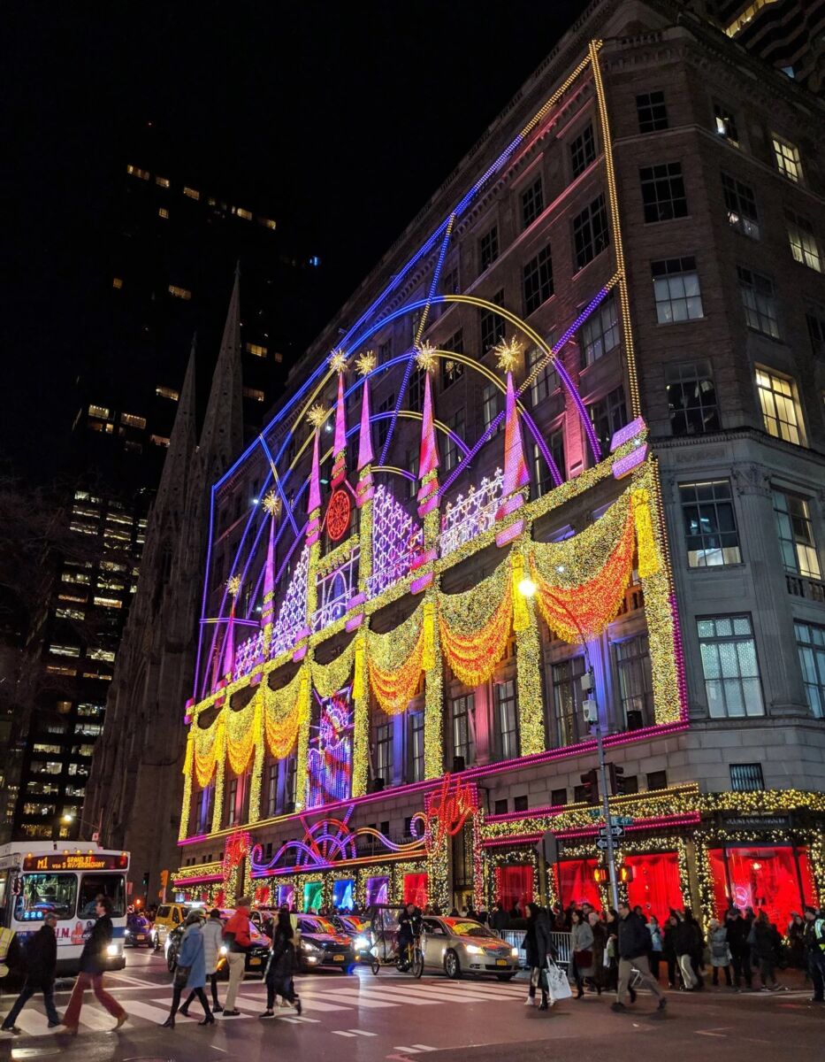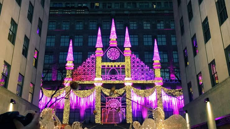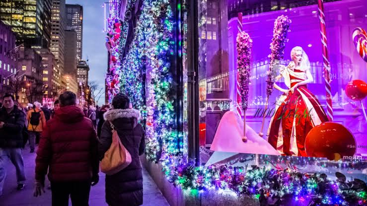 Συνεχίζουμε προς την Fifth Avenue, που μετατρέπεται κάθε χρόνο σε χριστουγεννιάτικο μπουλεβάρτο. Οι βιτρίνες των καταστημάτων – με κορυφαίες αυτές του Saks Fifth Avenue – παρουσιάζουν εντυπωσιακά σκηνικά: μικρά χωριά, νεράιδες, παγωμένα κάστρα και χιονισμένα τοπία που ζωντανεύουν με μουσική και κίνηση. Οι προσόψεις των κτιρίων φωτίζονται με χρωματιστά σχέδια που δημιουργούν μια ονειρική ατμόσφαιρα.