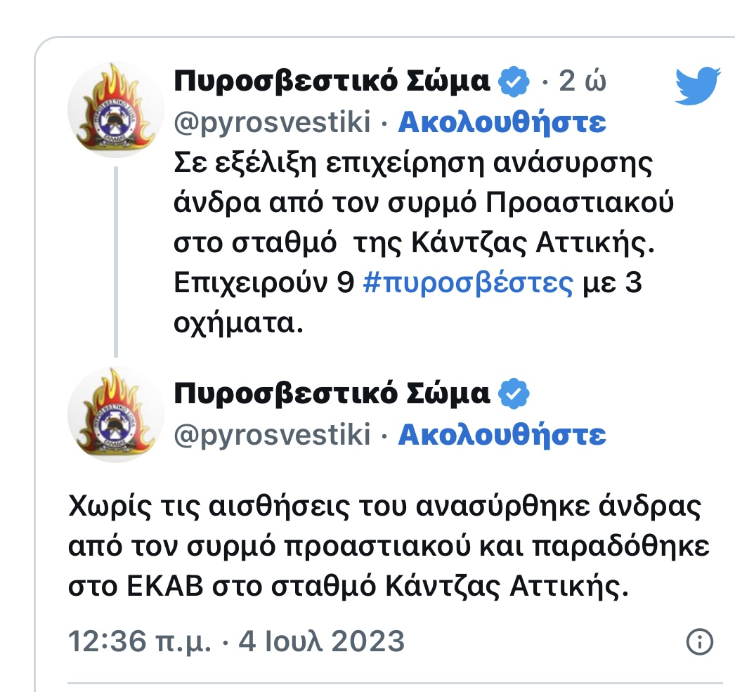 Σύμφωνα με την ενημέρωση της Πυροσβεστικής Υπηρεσίας, ένας άνδρας ανασύρθηκε από το συρμό του προαστιακού στο σταθμό της Κάντζας χωρίς τις αισθήσεις του και παραδόθηκε στο ΕΚΑΒ Αττικής.
