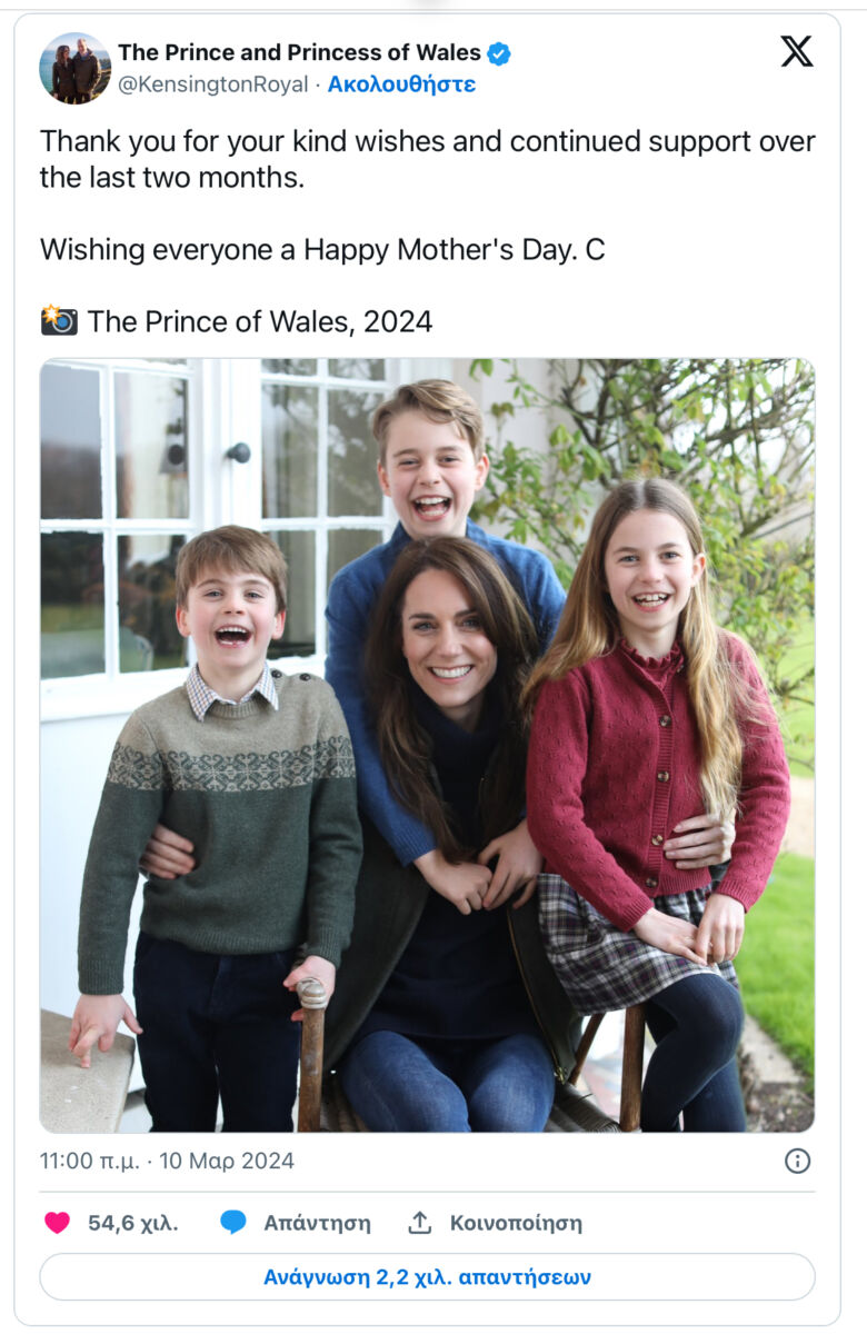 Με μία φωτογραφία που έδωσε στη δημοσιότητα το παλάτι ( την πρώτη μετά την χειρουργική επέμβαση ) η Κέιτ Μίνλτετον εμφανίζεται καθισμένη στον κήπο και φορώντας τζιν παντελόνι, ένα πουλόβερ και ένα σκούρο σακάκι, χαμογελαστή, περιστοιχισμένη από τα τρία παιδιά της, Τζορτζ, Σάρλοτ και Λούις, με αφορμή την Γιορτή της Μητέρας.