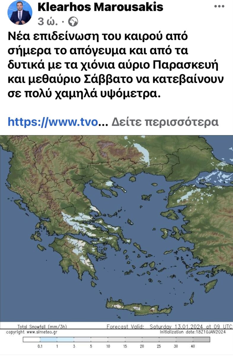 Στην ανάρτησή του ο Κλέαρχος Μαρουσάκης για τις επικείμενες χιονοπτώσεις σημειώνει πως τόσο η πορεία του βαρομετρικού χαμηλού όσο και οι θερμές θαλάσσιες εκτάσεις από τις οποίες θα περάσει δυσκολεύουν την πρόβλεψη καιρού των επόμενων ημερών και την «αντίδραση του Αιγαίου και το πώς αυτό θα αλληλεπιδράσει με την πολύ ψυχρή αέρια μάζα την οποία τα μετεωρολογικά μοντέλα τη θεωρούν με ένα εύρος θερμοκρασιών από -4° έως -8°. Αυτή η απόκλιση από μόνη της μόλις δύο περίπου 24ωρα από την εκδήλωση του φαινομένου δείχνει και το δυσκολοπροβλέψιμο της όλης κατάστασης».