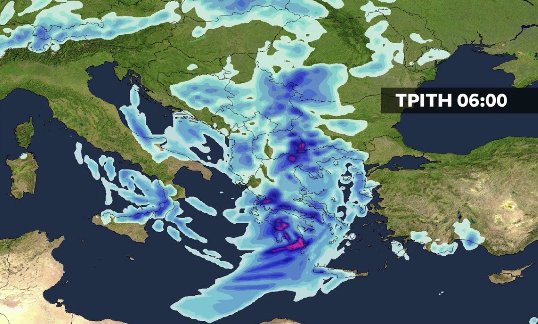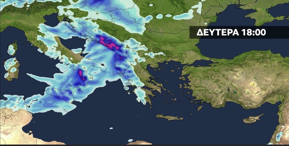 Ακολουθεί χάρτης όπου με τους χρωματισμούς αποτυπώνονται οι βροχοπτώσεις που αναμένονται από το απόγευμα της Δευτέρας και μέχρι το βράδυ της Τετάρτης περίπου. Όσο πιο σκούρα τα χρώματα τόσο πιο έντονα φαινόμενα προβλέπονται.