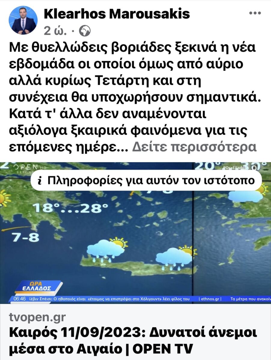 Τον κώδωνα του κινδύνου κρούει ο γνωστός μετεωρολόγος του Open, Κλεαρχος Μαρουσάκης  για τον καιρό του φθινοπώρου, καθώς όπως σημειώνει έπονται νέες επικίνδυνες κακοκαιρίες  επόμενους μήνες.