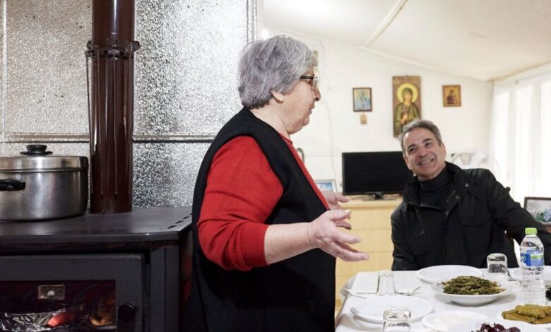 Μάλιστα, η κυρία Παπακωστίδου και ο σύζυγός της έκαναν το τραπέζι στον πρωθυπουργό. Ο κ. Μητσοτάκης δεν αρνήθηκε την πρόσκληση και, όπως φαίνεται και στις φωτογραφίες που ακολουθούν, κάθισε στο τραπέζι και συζήτησε με το ζευγάρι.Στο τραπέζι, το οποίο είχε νηστίσιμα εδέσματα, η σπιτονοικοκυρά είχε σερβίρει ντολμαδάκια, χόρτα και παντζάρια.