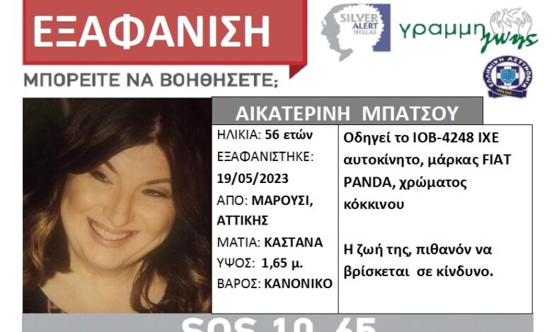 Ανησυχία επικρατεί στο Μαρούσι  έπειτα από την  εξαφάνιση της 56χρονης, Κατερίνας Μπάτσου, η οποία αγνοείτε  από τη Παρασκευή το πρωί . Μάλιστα, στους κόλπους της ΕΛ.ΑΣ. έχει σημάνει συναγερμός με τις έρευνες για τον εντοπισμό της να είναι σε πλήρη εξέλιξη.