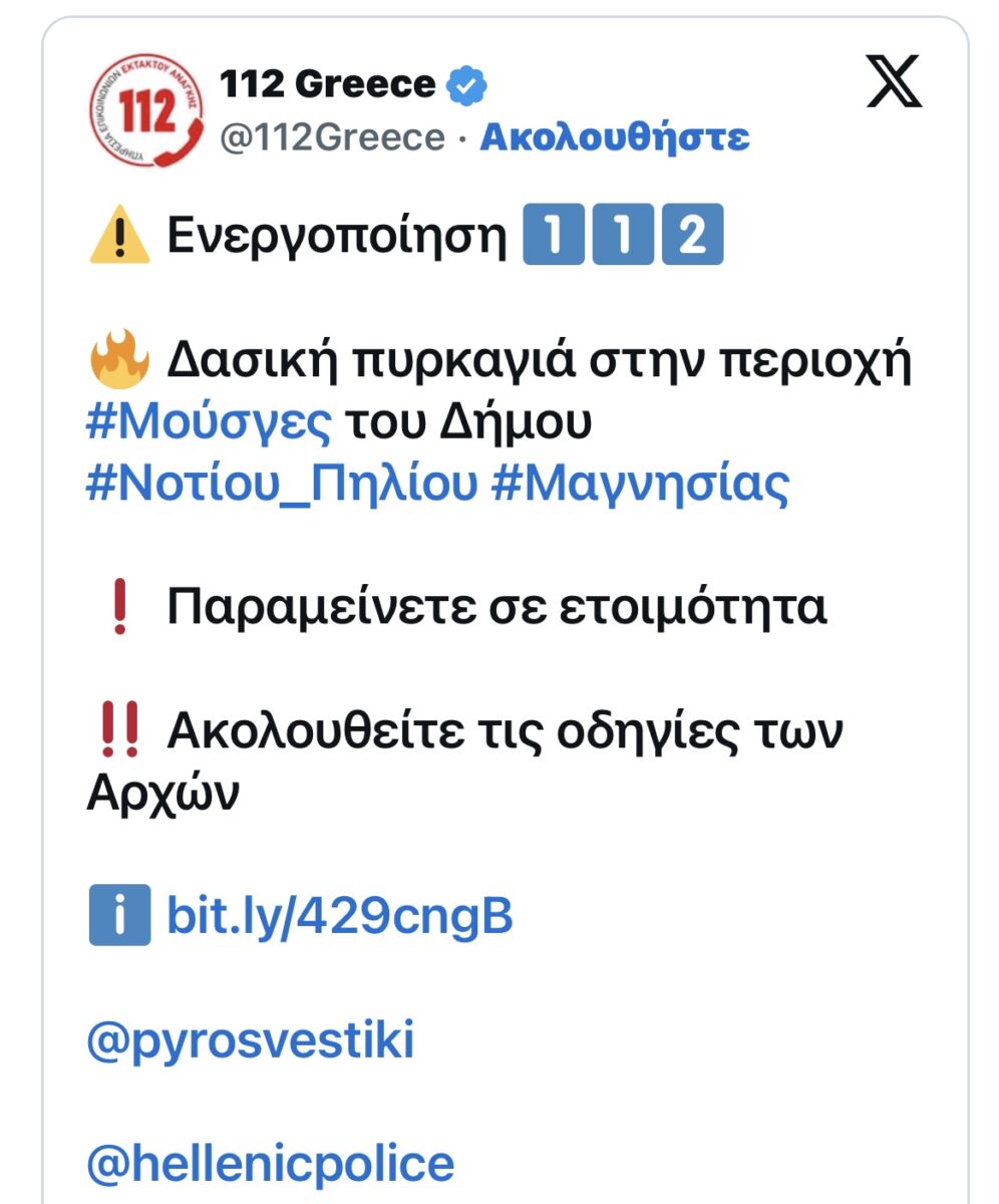Λίγο πριν από τις 18:00, ήχησε το 112 στους κατοίκους του Δήμου Ν. Πηλίου να παραμείνουν σε ετοιμότητα. Το θετικό είναι πως οι άνεμοι που πνέουν στο σημείο δεν είναι ισχυροί, με τη «μάχη» για τον έλεγχο της πυρκαγιάς να συνεχίζεται