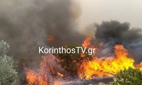 Μεγάλη φωτιά στα Στράβα Λουτρακίου από Κεραυνό