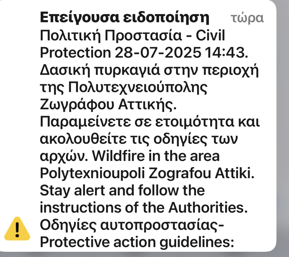 «Δασική πυρκαγιά στην περιοχή της Πολυτεχνειούπολης Ζωγράφου Αττικής. Παραμείνετε σε ετοιμότητα και ακολουθείτε τις οδηγίες των αρχών».