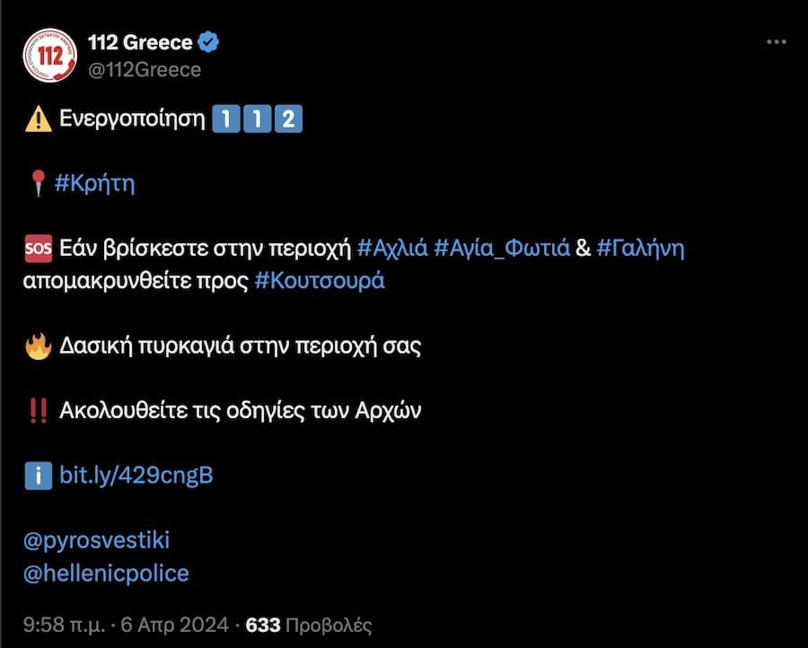 Πρόκειται για τους οικισμούς Αχλιά, Αγία Φωτιά, Γαλήνη και Μάυρος Κόλυμπος στον δήμο Ιεράπετρας. «Εάν βρίσκεστε στην περιοχή Αχλιά, Αγία Φωτιά και Γαλήνη απομακρυνθείτε προς Κουτσουρά», αναφέρεται στο πρώτο μήνυμα του 112.