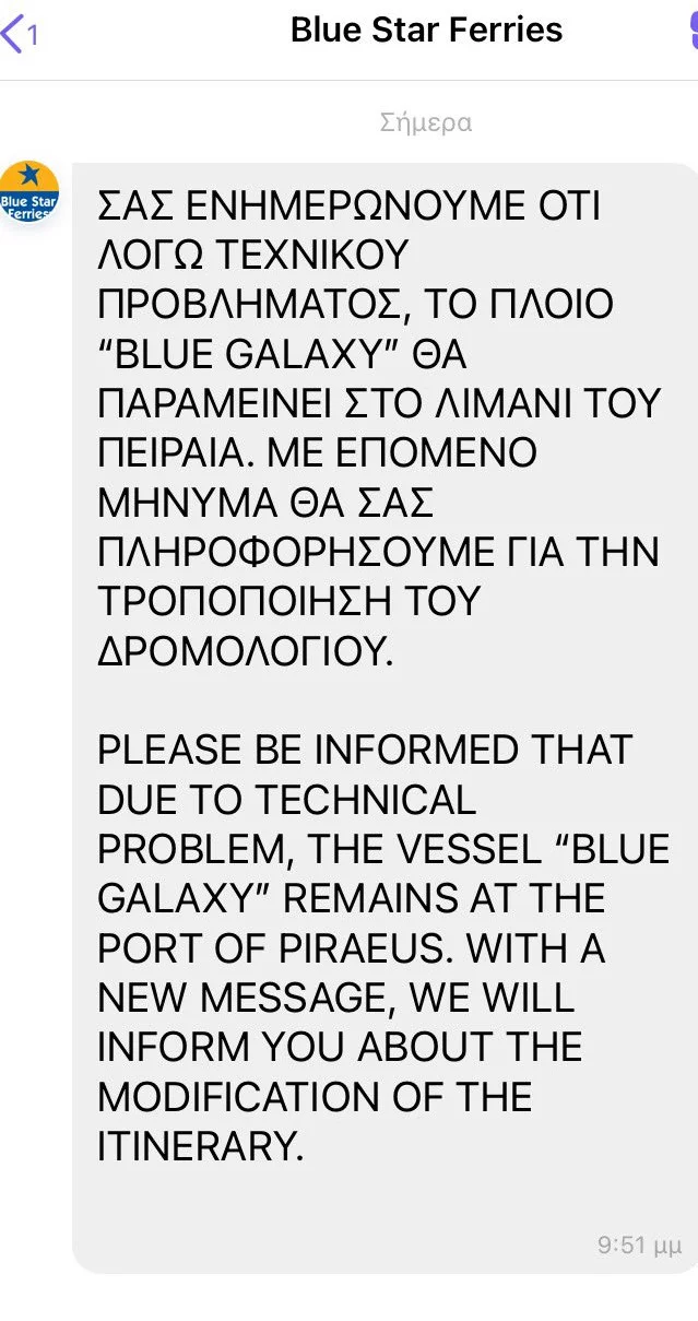 Επιβάτης του πλοίου δημοσίευσε με ανάρτησή του στο Twitter το μήνυμα που έλαβε στο κινητό του τηλέφωνο από την εταιρεία, με το οποίο ενημερώνονται όλοι οι επιβάτες πως το πλοίο θα παραμείνει στο λιμάνι του Πειραιά λόγω τεχνικού προβλήματος και με επόμενο μήνυμα θα πληροφορηθούν για την τροποποίηση του δρομολογίου.