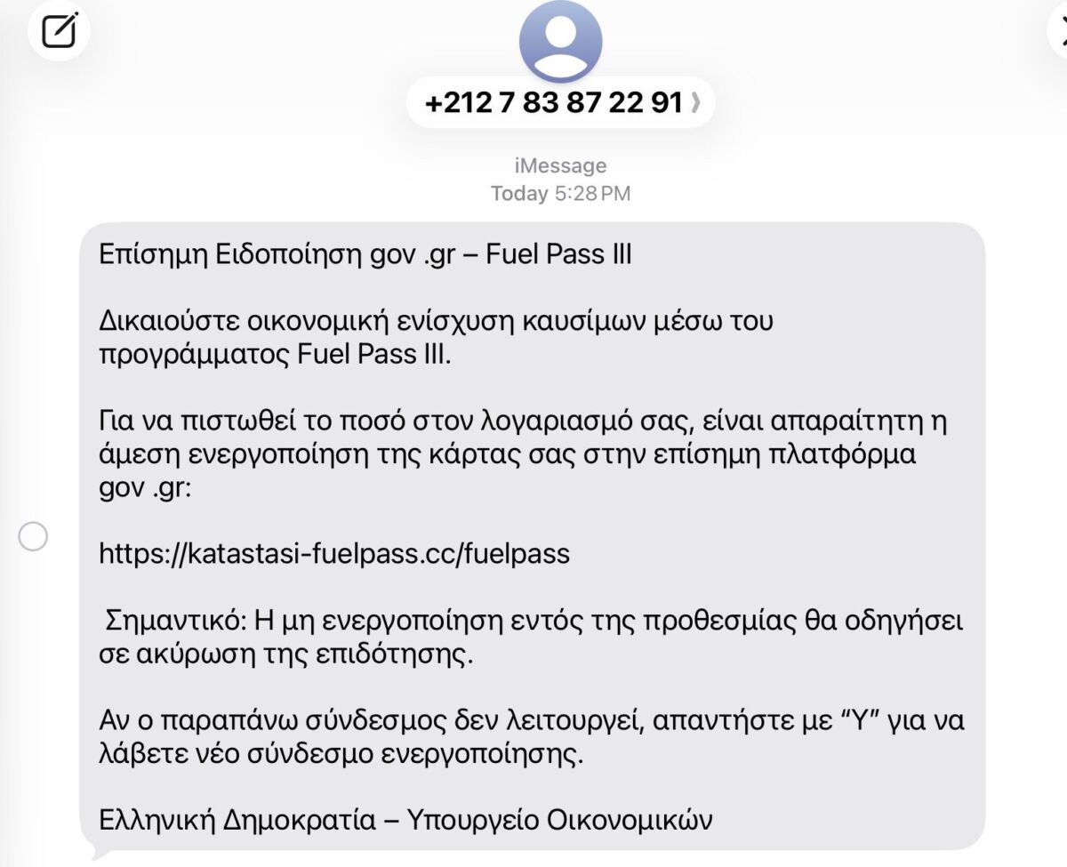 Ένα ακόμη παραπλανητικό SMS σχετικά με το Fuel Pass έλαβαν στα κινητά τους τηλέφωνα εκατοντάδες πολίτες σε όλη την Ελλάδα.