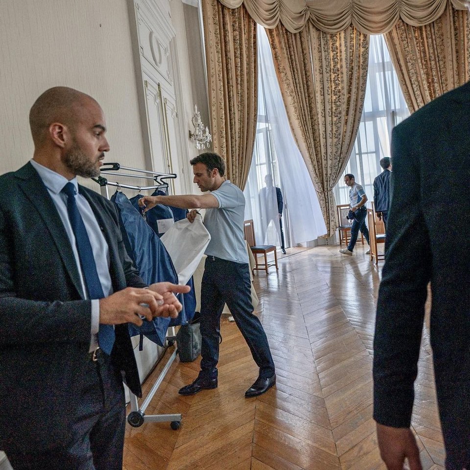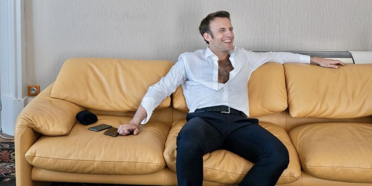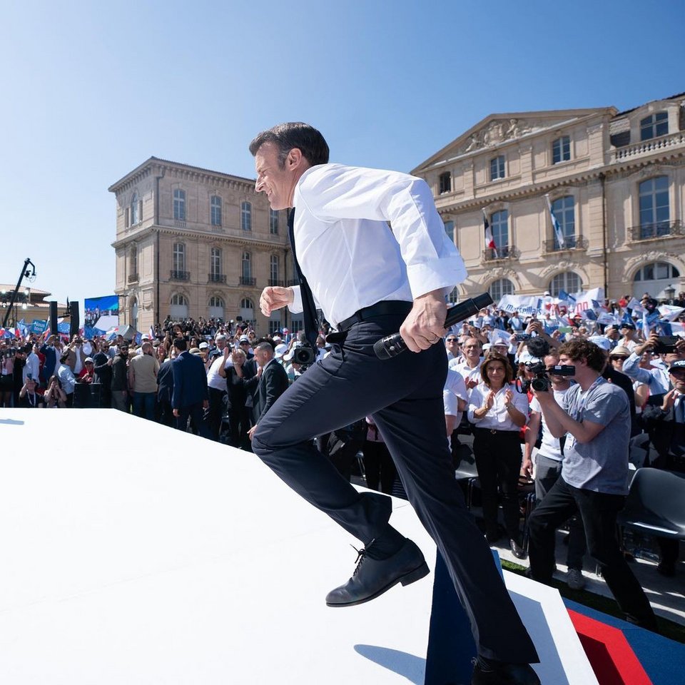 Πριν από την πρώτη εκλογική αναμέτρηση και εν μέσω του πολέμου στην Ουκρανία, βγήκαν στη δημοσιότητα φωτογραφίες του Γάλλου προέδρου αξύριστου και ράκος μετά από τηλεφωνήματα με Ευρωπαίους ηγέτες, σε μια προσπάθεια να βρεθεί μια ειρηνική λύση στον πόλεμο, ενώ σε μια άλλη περίπτωση, έδειξε το πρώτο ζευγάρι της Γαλλίας σε τρυφερό ενσταντανέ, στα αποδυτήρια του σταδίου «Paris La Défense Arena», πριν από μία ομιλία του.