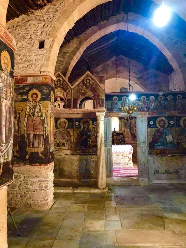 Μεγάλη εντύπωση έχει το τέμπλο που φέρει παλαιοχριστιανικά στοιχεία και γλυπτά μέλη. Στο εσωτερικό ο ναός κοσμείται με εκτεταμένο ζωγραφικό διάκοσμο με τοιχογραφίες του 18ου αιώνα, από τη σχολή του Γεωργίου Μάρκου, ενώ ελάχιστες τοιχογραφίες ανάγονται στη βυζαντινή περίοδο.